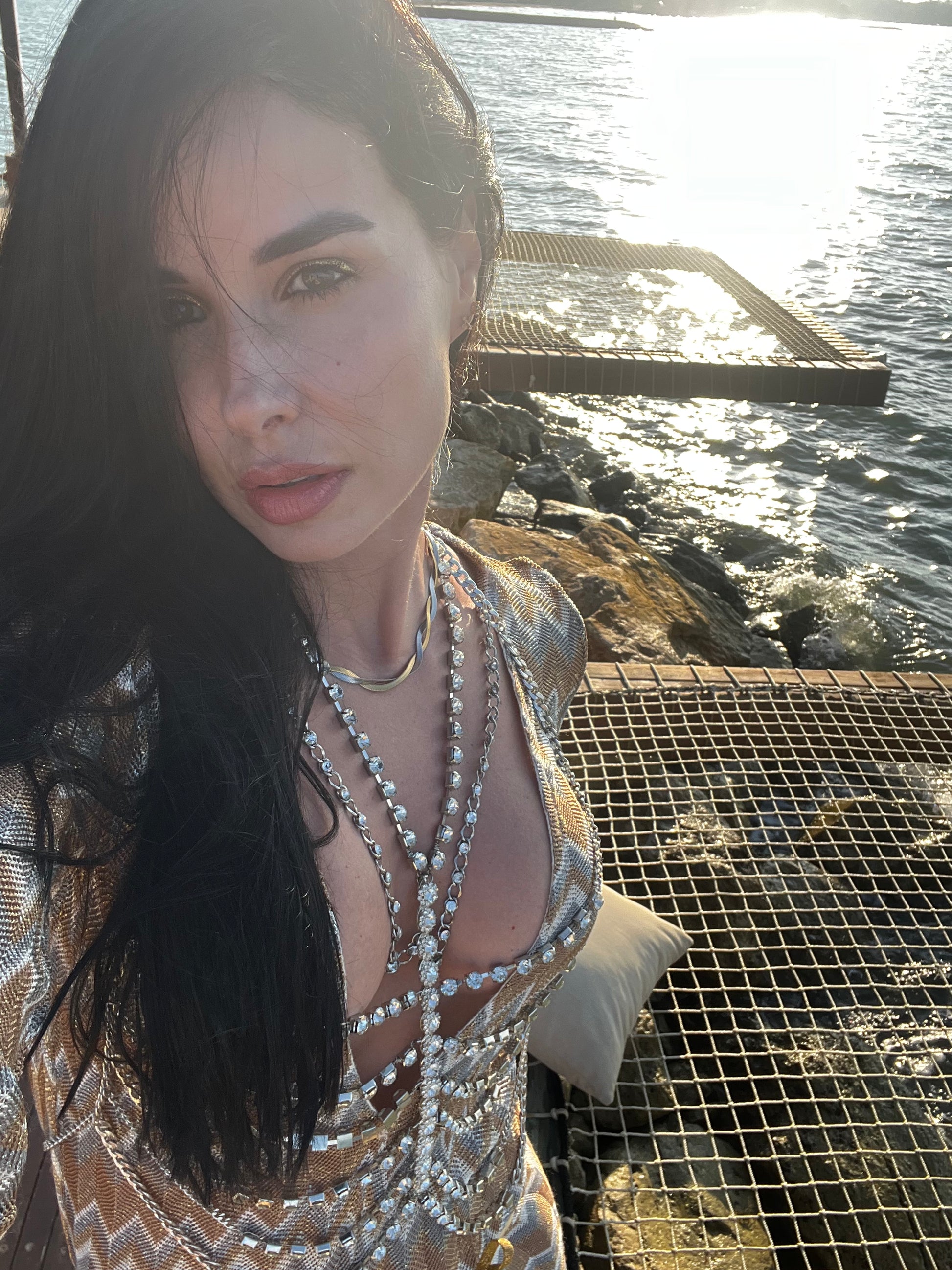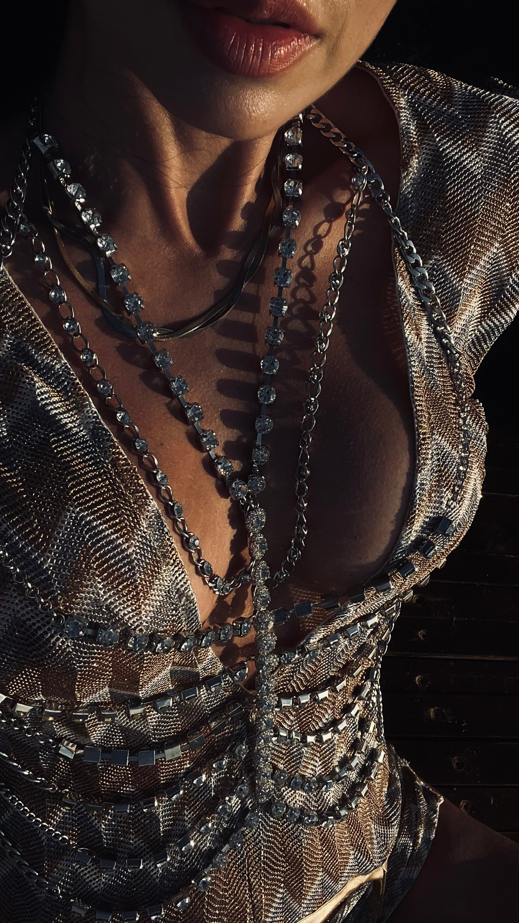 Top plateado con cadenas de piedras brillantes .